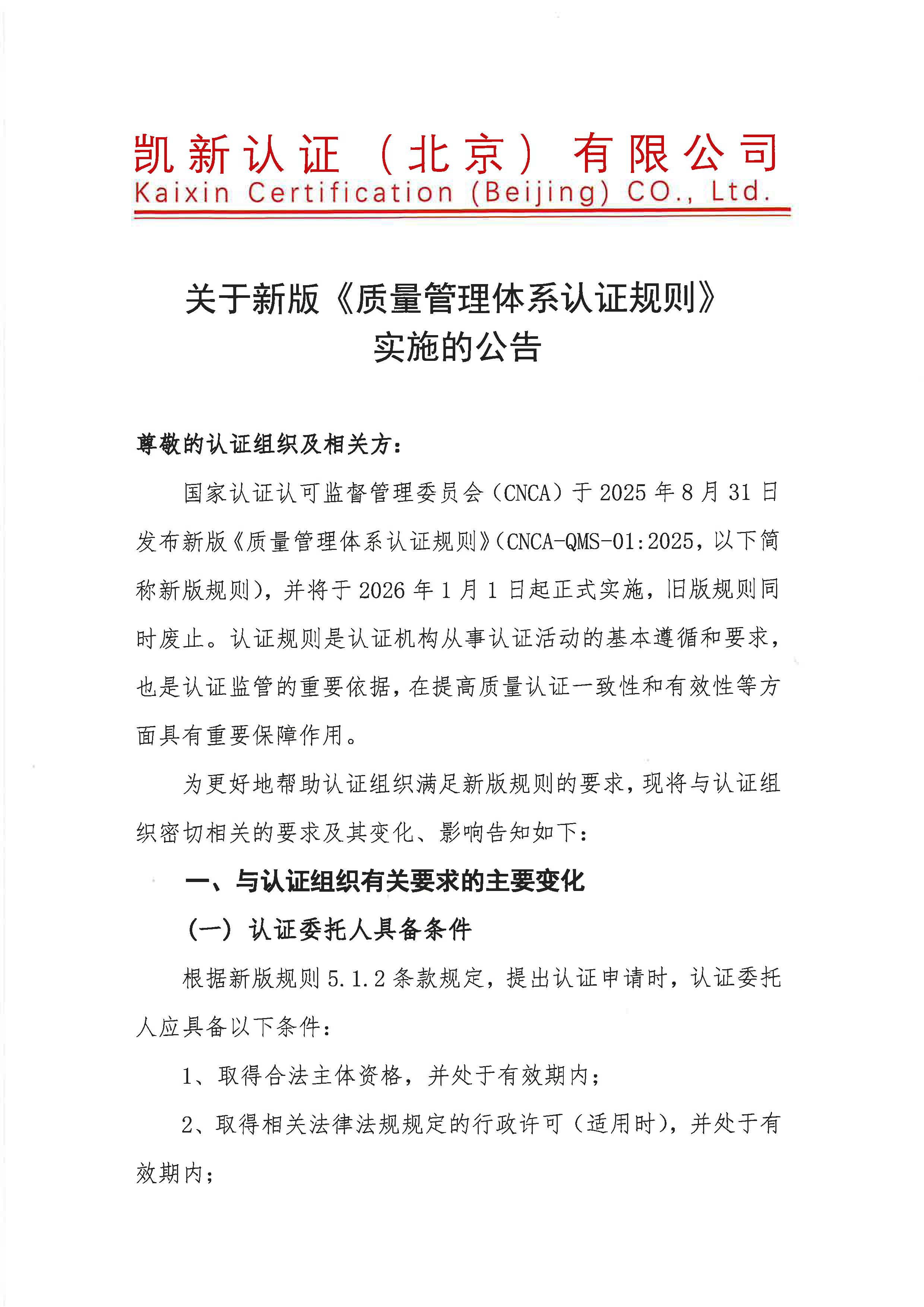 2025.12.01關(guān)于公司名稱和地址變更的通知根據(jù)公司戰(zhàn)略發(fā)展需要,經(jīng)北京市東城區(qū)市場(chǎng)監(jiān)督管理局核準(zhǔn),我司已完成以下變更事項(xiàng)。2025.11.11關(guān)于新版《質(zhì)量管理體系認(rèn)證規(guī)則》 實(shí)施的公告國(guó)家認(rèn)證認(rèn)可監(jiān)督管理委員會(huì)(CNCA)于2025年8月31日發(fā)布新版《質(zhì)量管理體系認(rèn)證規(guī)則》(CNCA-QMS-01:2025,以下簡(jiǎn)稱新版規(guī)則),并將于2026年1月1日起正式實(shí)施,舊版規(guī)則同時(shí)廢止。認(rèn)證規(guī)則是認(rèn)證機(jī)構(gòu)從事認(rèn)證活動(dòng)的基本遵循和要求,也是認(rèn)證監(jiān)管的重要依據(jù),在提高質(zhì)量認(rèn)證一致性和有效性等方面具有重要保障作用。2025.09.26EXCiPACT高級(jí)顧問(wèn)Iain Moore一行到訪Cotecna集團(tuán)北亞區(qū)&中國(guó)區(qū)總部2025年9月4日,EXCiPACT高級(jí)顧問(wèn)Iain Moore及中國(guó)區(qū)運(yùn)營(yíng)主管Nevin Cheng一行到訪Cotecna集團(tuán)北亞區(qū)&中國(guó)區(qū)總部,Cotecna集團(tuán)副總裁、北亞區(qū)總裁李文江先生及凱新認(rèn)證EXCIPACT審核員靳三省參與了本次接待。2025.09.26凱新認(rèn)證應(yīng)邀參加EXCIPACT asbl主辦的中國(guó)區(qū)培訓(xùn)會(huì)議2025年9月3日,由EXCiPACT asbl主辦,國(guó)際藥用輔料協(xié)會(huì)(中國(guó))與江蘇省醫(yī)藥包裝藥用輔料協(xié)會(huì)聯(lián)合協(xié)辦的“EXCIPACT-IPEC CHINA-SPPEA聯(lián)合藥用輔料GMP與風(fēng)險(xiǎn)評(píng)估培訓(xùn)會(huì)議”在南京玄武飯店召開,凱新認(rèn)證應(yīng)邀參加了本次培訓(xùn)會(huì)。